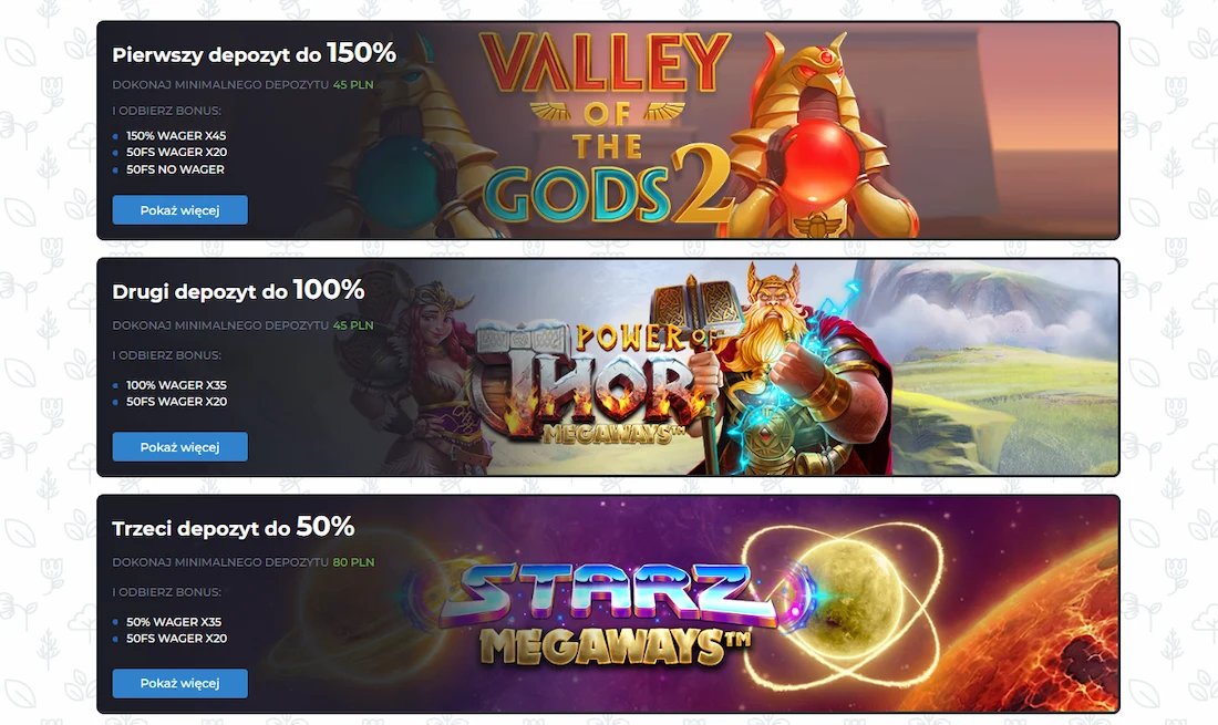 Skoro zaciekawiły Was darmowe spiny bez depozytu, to pójdźmy dalej. Każda z nowych osób może również skorzystać z pakietu powitalnego, który podzielony został na 3 części: